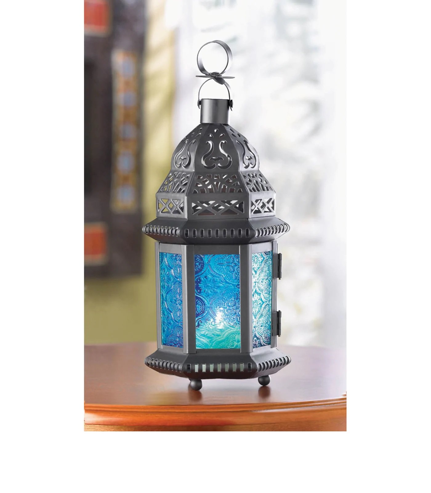 The combination of intricate metal cutouts and ornate glass designs create a gorgeous effect of flickering sky blue light that can either set the tone for outdoor events or cast an exquisite glow on your tabletop. Hinged glass panels make it easy to place the candle or LED light of your choice and is ideal for festive parties, weddings, outdoor lighting or as gifts. Available is a variety of colors including green, red, clear, mulberry, blue, yellow, purple, or amber - find the Moroccan Style Lantern that best fits your home.
