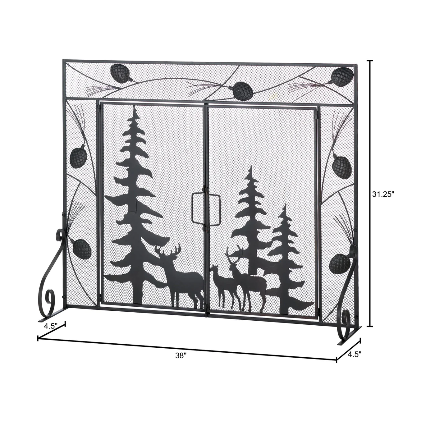 A wonderful woodland scene is yours to enjoy every day when you place this gorgeous iron screen in front of your fireplace. Detailed pine cones surround the outer trim, while the interior panels feature silhouettes of evergreens and forest creatures. It