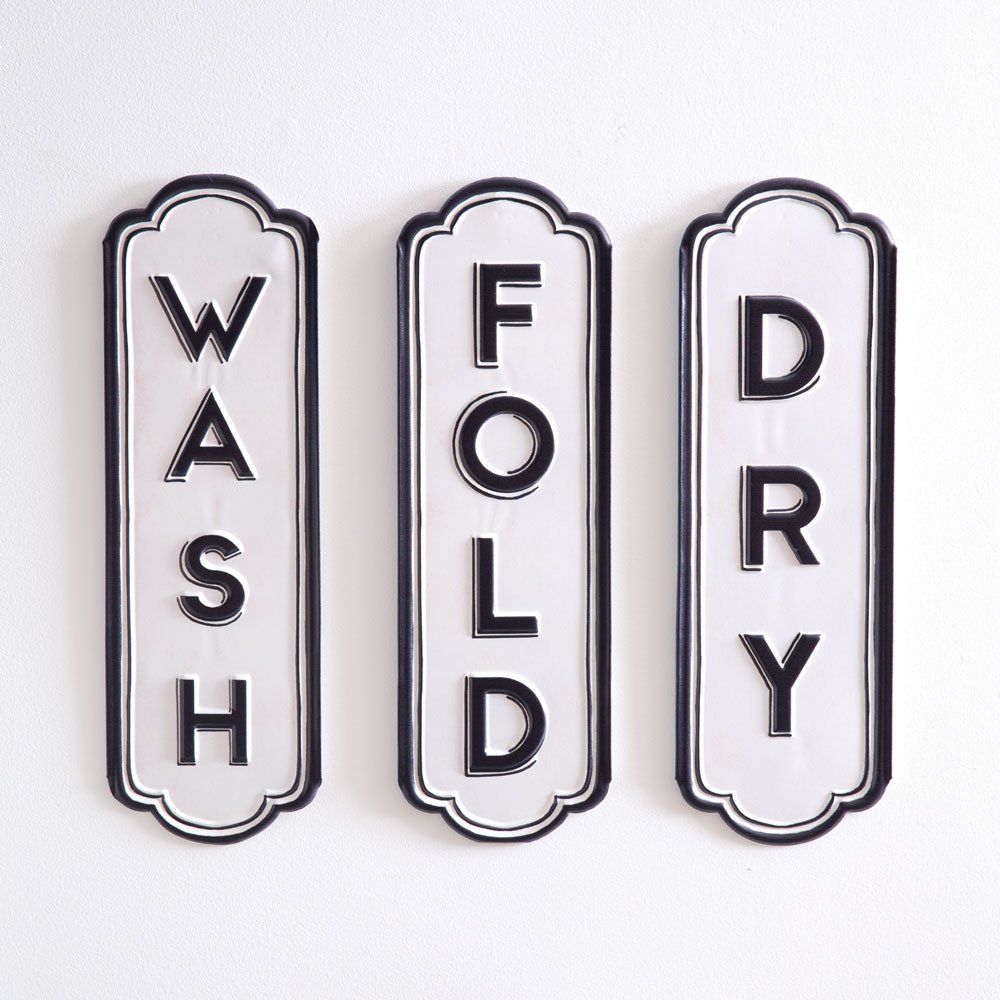 Never forget to do laundry again and add a charming touch to the washroom with our set of Wash, Dry, and Fold signs. Signs are made of metal. To hang each, use the triangle hanger on the back.