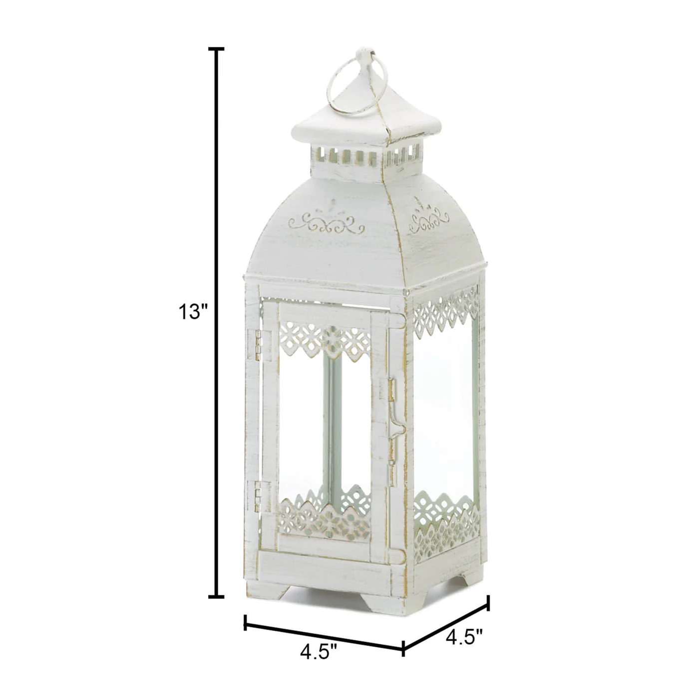 The decorative lantern features an iron frame in an antique-white finish with gorgeous white lace detailing. Perfect for farmhouse chic or French country décors, place your choice of candle or LED lighting inside the lantern with the easy to open front glass panels. Whether placed or hung, this lantern will illuminate your space in a stylish glow.